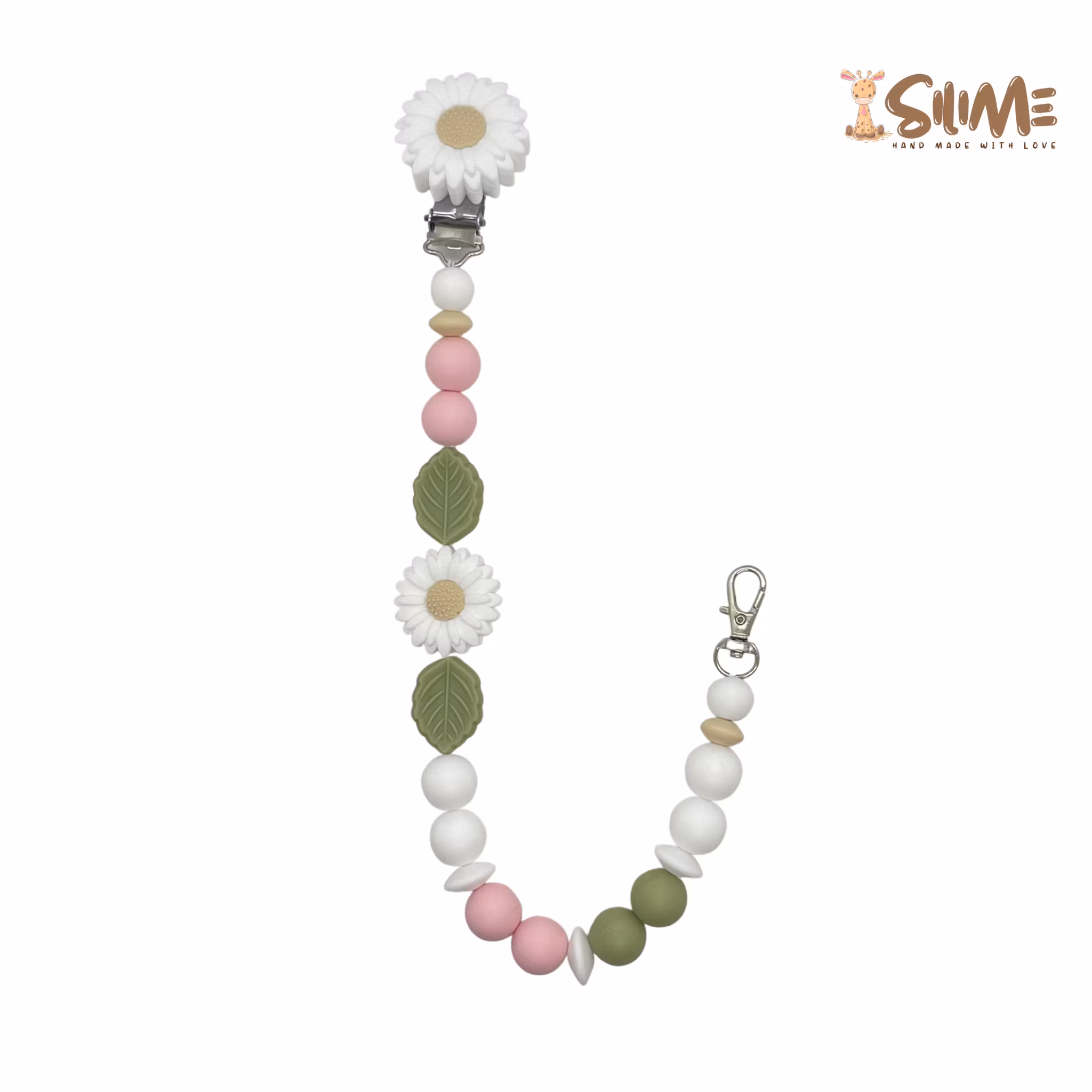 Badgehållare med silikonpärlor trädda på elastiskt band som fäster på ett clips i silikon.