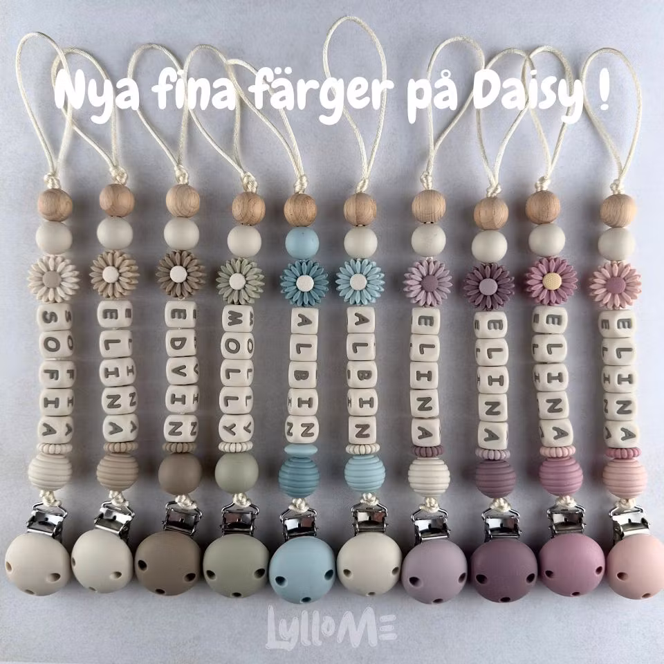 Napphållare med silikonpärlor, silikonpärla med en DAISY , valfritt namn /text och clip i silikon och en träpärla i bok i slutet av hållaren
