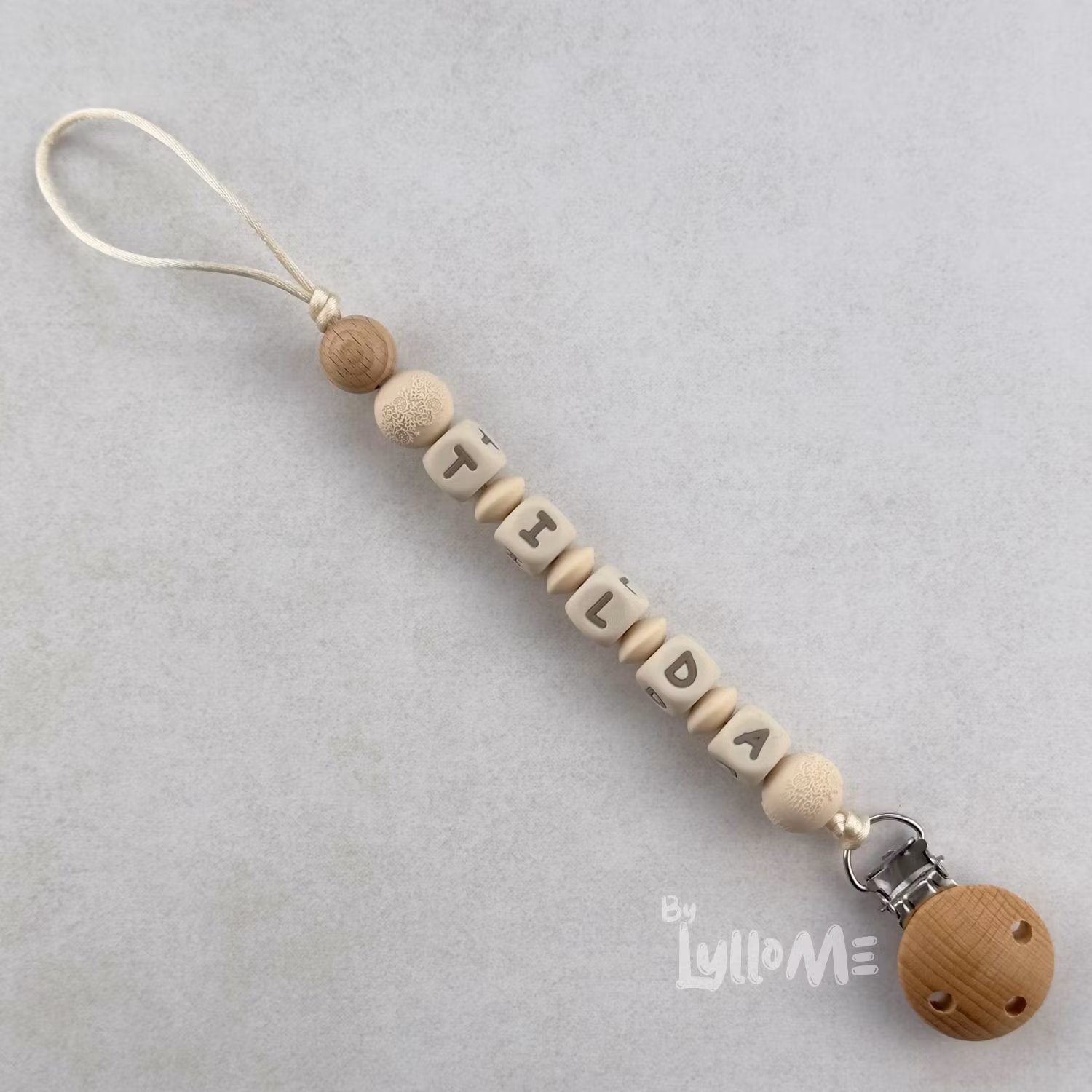 Napphållare med silikonpärlor och silikon pärlor med snyggt embossat mönster och valfritt namn /text och clip i bokträ och en träpärla i bok i slutet av hållaren
