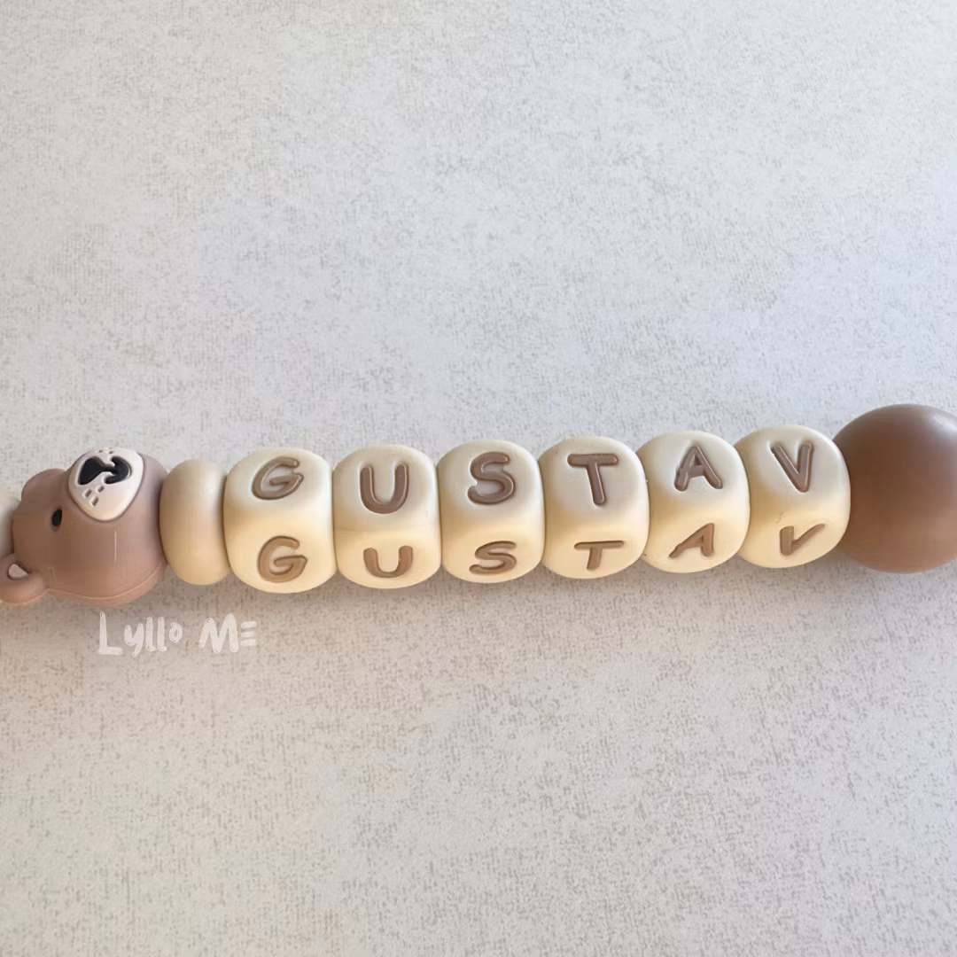 Napphållare med silikonpärlor , silikonpärla med söt Nalle, valfritt namn /text och clip i bokträ och en pärla i bokträ i slutet av hållaren