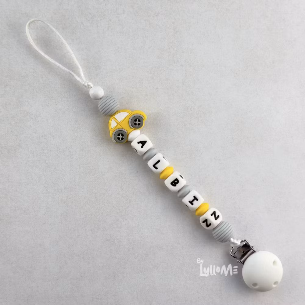 Napphållare med silikonpärlor, silikonpärla med en söt GUL BIL , valfritt namn /text och clip i silikon i matchande färg och en vit träpärla i slutet av hållaren