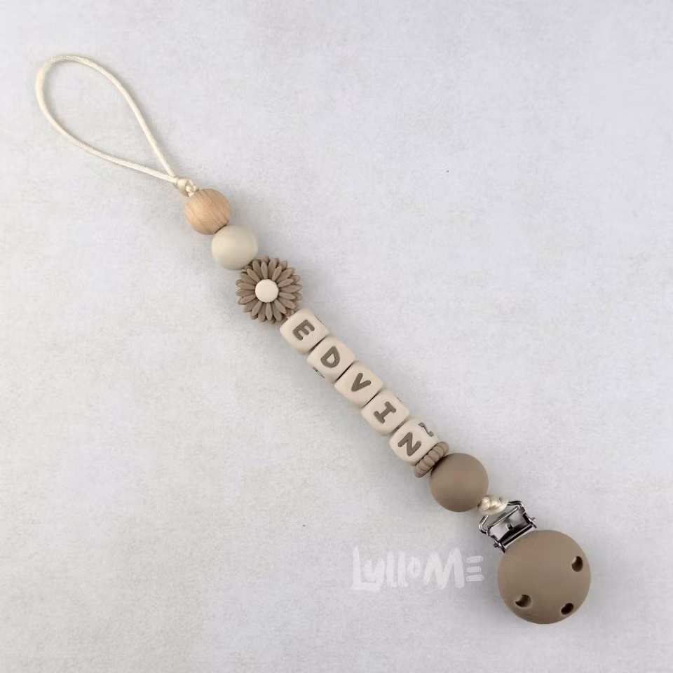 Napphållare med silikonpärlor, silikonpärla med en DAISY , valfritt namn /text och clip i silikon och en träpärla i bok i slutet av hållaren