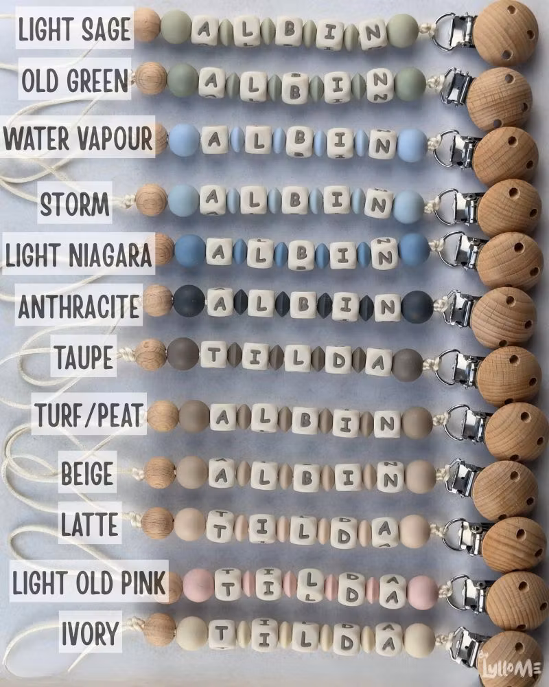 Stilren Napphållare med silikonpärlor valfritt namn /text och clip i bokträ och en träpärla i bok i början & slutet av hållaren